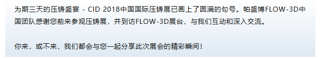 帕盛博FLOW-3D中國(guó)團(tuán)隊(duì)的技術(shù)經(jīng)理郝平先生分享了“壓鑄行業(yè)數(shù)字化工廠之仿真技術(shù)” 最后,帕盛博FLOW-3D團(tuán)隊(duì)感謝到訪的所有客戶、行業(yè)觀眾和朋友,我們將始終致力于全方面鑄造工藝的模擬和優(yōu)化,精益求精,時(shí)刻為您提供高效的鑄造工藝解決方案。