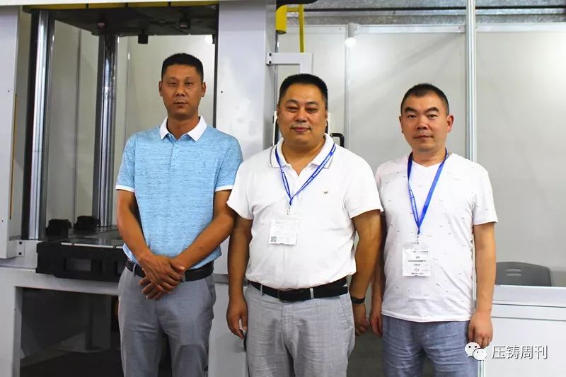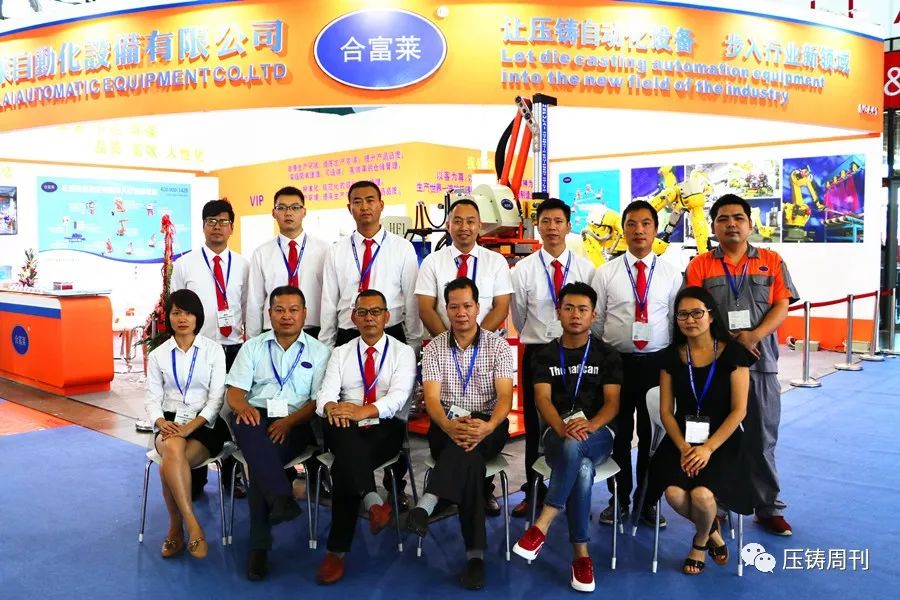 合富萊參展團(tuán)隊(duì),前排右三為楊炳榮先生 東莞合富萊此次展示多款技術(shù)先進(jìn)的壓鑄自動(dòng)化周邊設(shè)備,包括五連桿式高速給湯機(jī)(HFLLD-2#)、連桿式單伺服沃鈴噴霧機(jī)(HFLRADMW-2#)、連桿式伺服取出機(jī)(HFLEADM-2#)、熱室伺服噴取一體機(jī)(HFLREDMW-2#),以及噴霧、取件機(jī)器人壓鑄島(HFLYZD)系列,滿足不同客戶的需求。