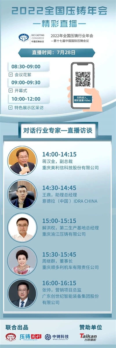 會(huì)議第一天(7月28日),主辦方將聯(lián)合《壓鑄周刊》、中鑄科技開設(shè)“專家訪談”直播間、“特色展示區(qū)現(xiàn)場(chǎng)采訪”,以在線直播形式對(duì)話行業(yè)專家及企業(yè)家,深度挖掘行業(yè)痛點(diǎn)與發(fā)展趨勢(shì),敬請(qǐng)關(guān)注!