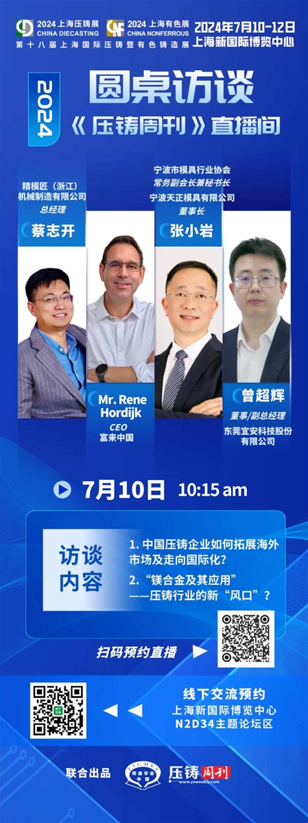 ![]() 《壓鑄周刊》傳媒展臺 2024年7月10-12日 上海新國際博覽中心 《壓鑄周刊》傳媒,展位:N3B23 2024年7月10-12日,備受矚目的“2024上海國際壓鑄展”將在上海新國際博覽中心舉行。《壓鑄周刊》傳媒,作為展會的戰略合作媒體和同期活動的協辦單位,將盛裝參加本屆展會。歡迎業界同仁光臨指導交流。展位號:上海新國際博覽中心N3館N3B23。 展會期間,《壓鑄周刊》傳媒還將攜手主辦單位,聯合舉辦“壓鑄行業年度創新技術發布會”,以及圍繞“壓鑄企業出海”、“鎂合金產業發展”兩個主題的“圓桌訪談”等活動,歡迎業界同仁前往論壇區觀看。 主題活動(一)