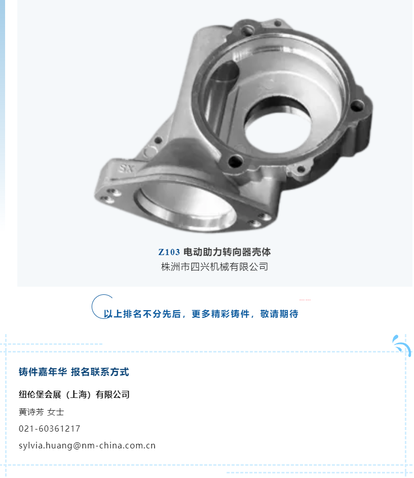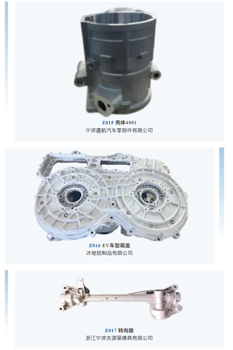 ![]() 2024上海國際有色壓鑄展 (CID&CNF) 將于7月10-12日在上海新國際博覽中心舉行,“鑄件嘉年華”活動將再度華麗登場,引爆全場! 本屆展會將在以往“精品鑄件鑒賞”及“優質鑄件評選及展示”基礎上,增加“技術小舞臺”,邀請參與活動的模具設計及技術人員與現場人員互動交流,分享在設計和生產加工過程中的心得經驗。更多精彩,敬請期待! 鑄件嘉年華 鑄件展示區 鑄件展播
