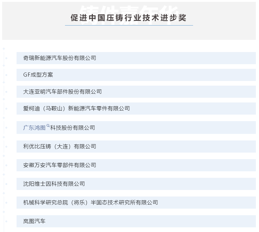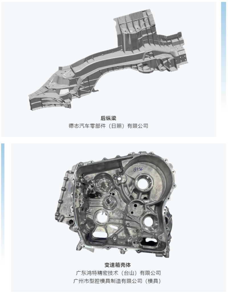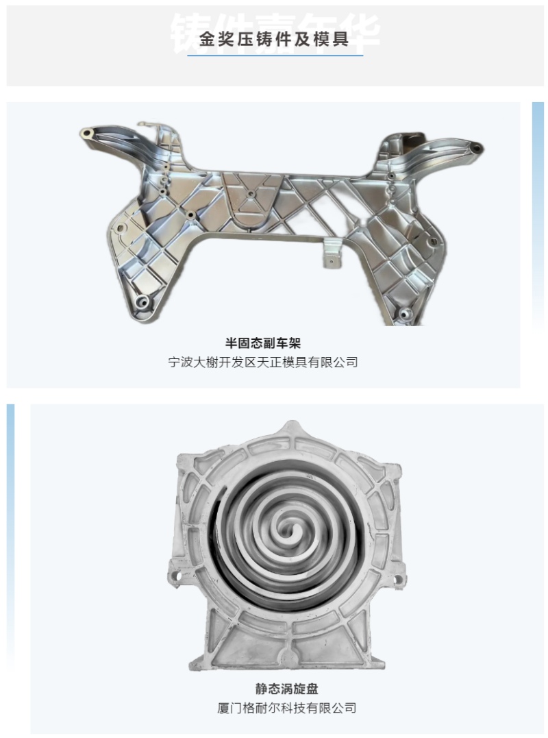 2024優(yōu)質壓鑄件評選 作為每屆鑄件嘉年華的重頭戲,“優(yōu)質壓鑄件評選活動”是業(yè)界廣為關注、廣泛參與的評選活動。旨在表彰和推廣在鑄件設計、生產、質量等方面表現突出的企業(yè)和產品。本屆評選共有35家企業(yè)、48個鑄件入圍現場終選環(huán)節(jié),經過中國機械工程學會鑄造分會特聘專家組專業(yè)、嚴謹的現場評審,最終評選出具有代表性的金獎鑄件及金獎模具各6件,優(yōu)秀鑄件及優(yōu)秀模具各12件。這些獲獎鑄件及模具在材料選擇、工藝設計、產品質量等方面均表現出色,為行業(yè)樹立了標桿和典范。鑄件評選活動與鑄造行業(yè)的展覽會等活動相結合,為行業(yè)內的企業(yè)和產品提供一個展示和交流的平臺。通過評選活動,可以鼓勵企業(yè)加強技術創(chuàng)新、提升產品質量、推動行業(yè)進步。同時,評選結果也能為行業(yè)內外提供一份權威的參考,引導市場消費和投資方向。 本屆展會緊跟新能源汽車發(fā)展趨勢,精心打造“新能源汽車精品鑄件展示區(qū)”與“新能源街區(qū)”,匯聚多家著名主機廠與壓鑄廠,集中展示其先進的壓鑄技術。 活動主辦單位在7月10日晚舉辦的2024上海國際壓鑄有色展-“盛典之約”頒獎典禮暨菁英晚宴期間舉辦了“優(yōu)質壓鑄件評選”、“促進中國壓鑄行業(yè)技術進步獎”頒獎典禮,業(yè)界領導和專家為獲獎單位頒發(fā)獎杯與證書予以表彰。