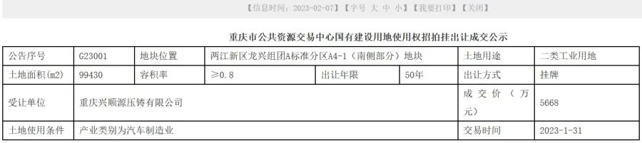 更值得一提的是,該項(xiàng)目的壓鑄件模具由美利信科技全資子公司——廣澄模具自主研發(fā)制造,充分展示了廣澄模具在超大型一體化壓鑄模具方面的先進(jìn)技術(shù)水平和制造能力,具有重要戰(zhàn)略意義。 重慶渝江壓鑄購買近10萬平米工業(yè)用地 2月7日,重慶市公共資源交易中心發(fā)布消息,重慶興順源壓鑄有限公司以5668萬元競得重慶市兩江新區(qū)龍興組團(tuán)A標(biāo)準(zhǔn)分區(qū)A4-1(南側(cè)部分)地塊使用權(quán),土地面積為99430平方米,該地塊使用產(chǎn)業(yè)類別為汽車制造業(yè)。