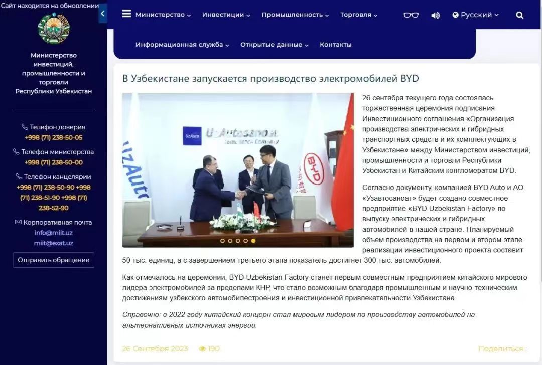 據(jù)介紹,該項(xiàng)目由無錫貝斯特精機(jī)股份有限公司投資建設(shè),規(guī)劃用地約240畝,分兩期建設(shè)。項(xiàng)目共新建廠房及配套設(shè)施約13萬(wàn)平方米,主要從事新能源汽車零部件產(chǎn)品的生產(chǎn)和銷售。一期新建廠房及配套設(shè)施面積約7萬(wàn)平方米,新購(gòu)壓鑄機(jī)、CNC加工中心等各類設(shè)備,主要從事新能源汽車鋁合金電機(jī)殼和轉(zhuǎn)向節(jié)等產(chǎn)品的生產(chǎn)和銷售。 比亞迪在烏茲別克斯坦投資汽車工廠 據(jù)媒體報(bào)道,烏茲別克斯坦投資、工業(yè)和貿(mào)易部網(wǎng)站發(fā)布聲明,宣布2023年9月26日與比亞迪簽署《在烏茲別克斯坦生產(chǎn)電動(dòng)和混合動(dòng)力汽車及其零部件投資協(xié)議》。