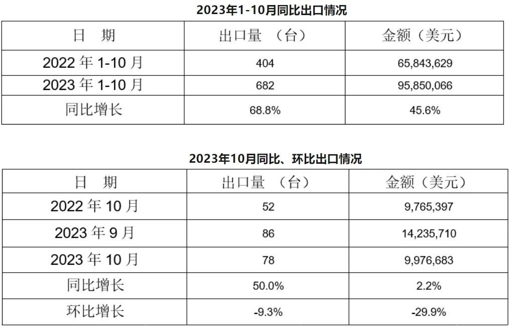 其中,壓鑄機業務收入19.97億港元,同比減少2.6%;注塑機業務收入6.78億港元,同比增長2.7%;加工中心業務收入7947.9萬港元,同比減少47.1%。公司表示,由于下游客戶資本開支放緩,大部分機器的交付周期延遲集中在下半財年,導致上半財年的業務收入同比略有下滑。 1-10月冷室壓鑄機出口682臺 來自中國鑄造協會的消息,根據海關數據統計,2023年1-10月,冷室壓鑄機共計出口682臺,同比增長68.8%。其中:10月出口78臺,同比增長50%,環比下降9.3%。