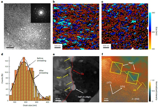 據介紹,氧化物彌散強化(ODS)合金是用于極端環境(例如高溫和耐輻射應用)的前沿高強度材料。到目前為止,科學家已經通過化學加工方法開發了可還原金屬的 ODS 合金,但由于氧化物顆粒均勻分散的挑戰,還沒有商用的不可還原金屬(即 Al 鋁、Mg 鎂、Ti 鈦、Zr 鋯等)的 ODS 合金。 何春年團隊提出了一種通過粉末冶金獲得含有高度分散的 5nm MgO 納米顆粒的 ODS 鋁合金的策略,使用具有原位生長的類石墨烯涂層的納米顆粒。值得注意的是,密集分散的 MgO 納米顆粒與 Al 鋁基體具有完全共格關系,可有效抑制界面空位擴散,從而在高達 500°C 的溫度下實現前所未有的抗拉強度(200MPa)和抗蠕變性。 |