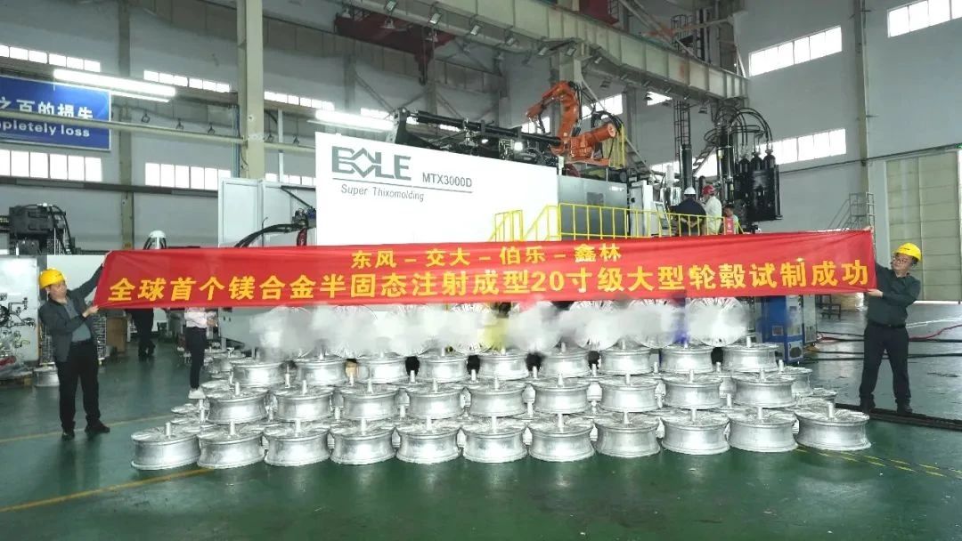 圖源:長城汽車 作為國內新能源汽車及零部件全產業鏈的領軍企業,長城汽車此次攜手全球鎂合金材料的龍頭企業寶武鎂業,聯合組建了一支技術攻關團隊,在去年8月,使用海天HMG3000鎂合金注射成型機成功試制出全球首個半固態注射成型鎂合金減震塔,該件比傳統鑄鋁件減重10%。 鎂合金半固態注射成型20寸級汽車輪轂在寧波試制成功 近日,由東風汽車旗下東風汽車車輪隨州有限公司與上海交通大學曾小勤教授團隊牽頭,聯合伯樂智能裝備股份有限公司、寧波鑫林模具科技有限公司、上海昆悟新材料科技有限公司,成功開發出鎂合金半固態注射成型20寸級大型汽車輪轂,其成型重量達到16kg+,這也刷新了鎂合金半固態注射成型零件的最大注射量世界紀錄。
