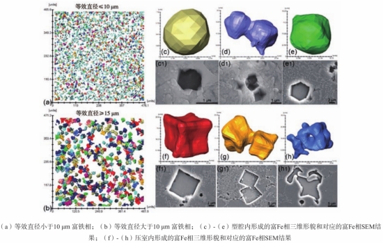 圖4 AM60壓鑄鎂合金孔洞三維形貌 1.2 富 Fe 金屬間化合物 在鑄造鋁合金中,Fe元素會與其他元素形成脆性的富Fe相,并在拉伸過程中成為裂紋起源,對鑄件的力學性能產生不利影響。高真空壓鑄鋁合金憑借其優勢,被廣泛應用于汽車結構件的生產。隨著對產品性能要求的日益攀升,迫切需要制造出具備高力學性能的鑄件。因此,對高真空壓鑄鋁合金中富Fe金屬間化合物的研究日益增多。富Fe金屬間化合物與鋁基體之間較大的密度差為X射線斷層掃描分析提供了便利。但在鋁/鎂合金壓鑄過程中,由于X射線無法穿透鋼模具,所以很難對合金的凝固過程進行實時觀察。因此,利用X射線斷層掃描技術分析研究壓鑄鋁/鎂合金中的富Fe金屬間化合物只能在鑄件成形后進行。 Xiong等人利用該技術研究了壓鑄亞共晶鋁-硅合金中富Fe相的形貌和形成機制,如圖5(a)所示。