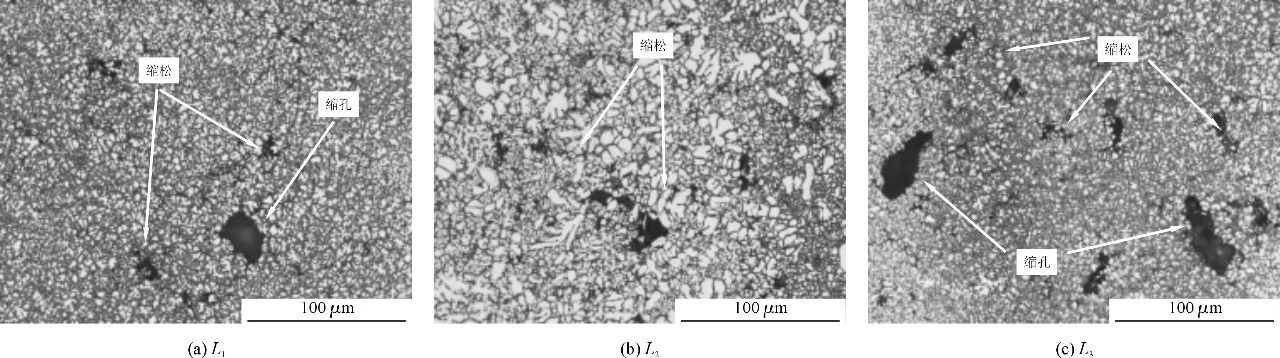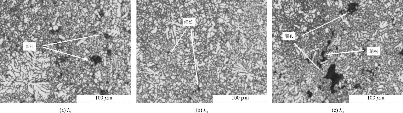 圖4 L1散熱片表面缺陷 采用L1~L3工藝參數分別制取普通壓鑄件與真空壓鑄件若干。分別對3組試驗制取的普通壓鑄件和真空壓鑄件進行取樣,取樣位置分為散熱片第2片和底板兩部分,見圖2。采用電火花線切割機制取金相晶相試樣和拉伸試樣,用JHY-5000電子萬能實驗機對散熱片進行力學性能測試。可以看出,L1散熱片上存在尺寸較大的縮孔和分布范圍較廣的縮松;L2散熱片上的縮松范圍較小,尺寸較小;L3散熱片存在尺寸較大的縮孔和縮松。L1底板存在尺寸較小的縮孔但分布范圍廣;L2底板存在少量縮松和尺寸較小的縮孔;L3底板存在多處縮松和縮孔。分析認為,采用自主設計的真空抽氣系統能夠把模具型腔的大部分氣體抽出,因而制得的真空壓鑄件內部氣孔有所減少,但由于快壓射速度不同導致抽真空時間不同,模具型腔的最終氣壓也不同,型腔里金屬的流動狀態也有差異,所以3組試驗制得的真空壓鑄件其縮松、縮孔也有差別。 表3 散熱片力學性能