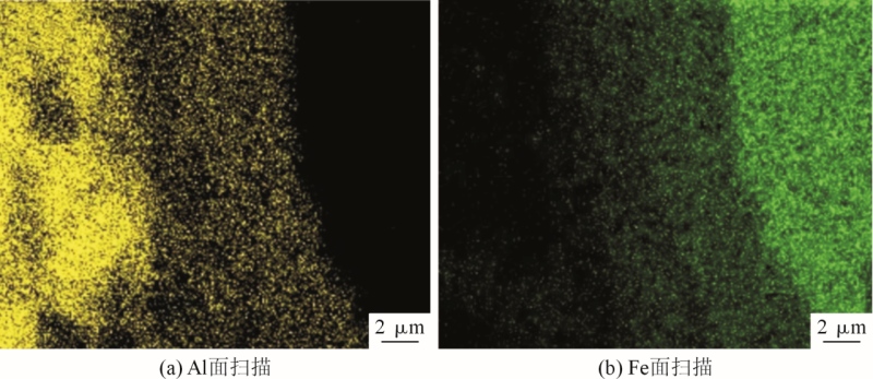 圖4 雙金屬復合界面結合層厚度和熱處理時間的關系 圖5為圖3d位置對應的EDS面掃結果。可以看出,Fe、Al元素在垂直于復合界面的方向上呈梯度分布。Fe、Al之間可以生成固溶體、金屬間化合物甚至是共晶組織,且可生成的金屬間化合物種類較多。但是在225~600 ℃時,Fe在Al中的固溶度僅為0.010%~0.022%。在熱處理條件下,Fe-Al之間主要以金屬間化合物的形式存在,可能存在的化合物類型有Fe3Al、FeAl、FeAl2、Fe2Al5及FeAl3等。表3為圖3中的EDS點掃結果,可以推測出經過2 h熱處理后的界面結合層物相主要為FeAl3相,而經過4 h和6 h熱處理后的界面結合層物相主要為靠近A380側的FeAl3相和靠近HT250側的Fe2Al5相。