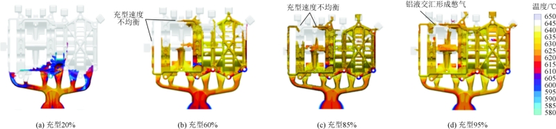 圖3 連接支架壓鑄充型過程溫度模擬