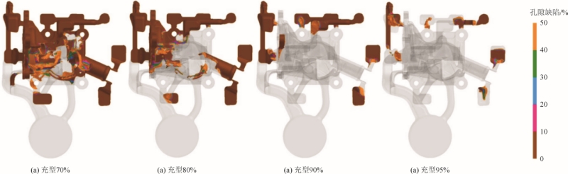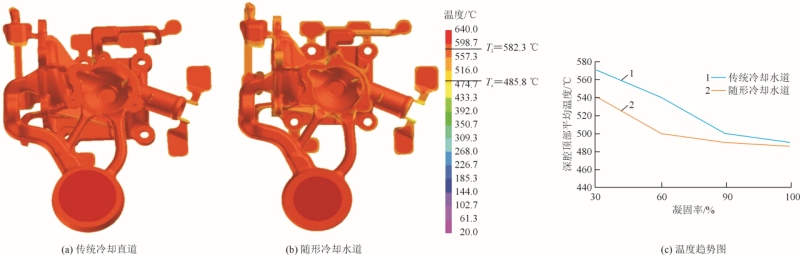 圖8 活塞運動速度與時間關系圖 用模流軟件中的void預測模型充型過程中易出現裹氣的部位,見圖9。可以看出,當鑄件充型70%時最開始填充離內澆口最近的碗形深腔頂部,而在充型80%的時候,深腔頂部和3個圓孔基本充滿,說明充滿深腔頂部的金屬液流速很快,這不利于內部收縮甚至產生縮孔。鑄件充型90%時,除溢流槽和一側邊圓孔外,鑄件內部已經充填完畢,而在充型95%時,只有溢流槽部分未充滿,表明側邊單一圓孔金屬液填充速度過快,容易出現縮孔缺陷。圖10為兩種冷卻水道的鑄件凝固30%時溫度場及溫度趨勢??梢妭鹘y冷卻水道的碗狀深腔溫度約為570℃,而帶有隨形冷卻水道效果更優,深腔邊緣溫度約為540℃,頂部為557℃,在型腔內部能夠避免熱節處出現孤立液相區導致無法補縮的問題,進而避免縮松縮孔缺陷的發生。 圖11為帶有傳統冷卻水道和隨形冷卻水道模具充型凝固完成后的溫度場,將其沿著XY、XZ方向切片,對比模具溫度變化。從沿著XZ切片圖可以看出,在深腔頂部左外表面上和深腔內部溫度隨形水道的冷卻效果優于傳統水道。隨形冷卻水道左表面溫度梯度由少部分溫度區間226.7~268℃轉變為大部分,且深腔內部268.0~309.3℃的溫度呈降低趨勢。圖12為深腔最終凝固時間分布圖。