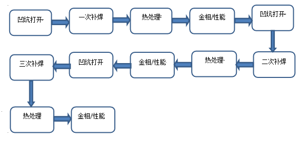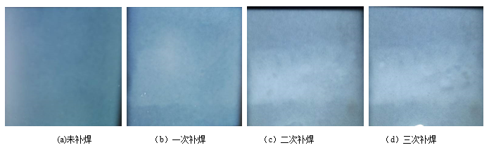 圖4 取樣部位示意圖 二:試驗結果分析 焊接接頭的無損檢測 圖5為未補焊和補焊一次、二次、三次X射線探傷底片。可以看出,每次焊接后,旱區與母材過渡良好,經X射線檢測符合HB963-2005Ⅰ類件要求,外觀檢查無宏觀缺陷,經熒光檢驗未發現超標缺陷。
