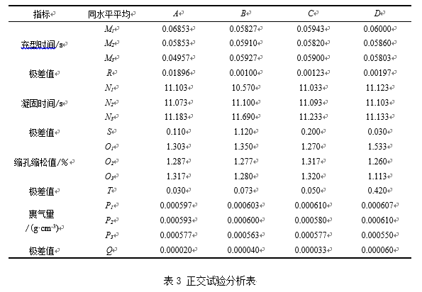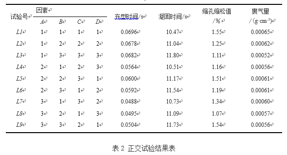 四、正交試驗設計及工藝參數優化 正交試驗設計 影響壓鑄件質量的因素有很多,例如內澆口的厚度大小及模具預熱溫度、澆注溫度、壓射速度等 。選擇壓射速度(A)、模具預熱溫度(B)、澆注溫度(C)、內澆口厚度(D)為因素,以充型時間、凝固時間、縮孔縮松量及裹氣量為指標建立4因素3水平正交試驗表。其中,縮孔、縮松量由平均體積分數來表示。表1為因素水平表,表2為正交試驗結果表。
