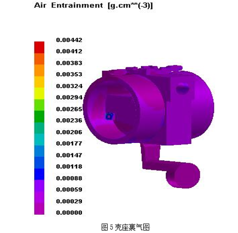 通過充型時間和充型指標兩個判斷標準來確定各組工藝參數下充型過程的好壞。充型指標是對在壓力鑄造過程中的流動狀態:層流、紊流、裹氣、沖刷、澆不足等現象的綜合評價。根據表3可知,壓射速度對鑄件充型時間的影響較大,當壓射速度越大,充型時間也就相對越少。由于在相同條件下,壓射速度越大,金屬液體進入內澆口的速度越大,導致了鑄件的充型時間越少。 凝固過程的模擬主要是觀察和分析溫度的的變化與趨勢。分析表3可知,模具預熱溫度對凝固時間的影響最大,這是因為模具預熱溫度越高,金屬液的散熱速度就越慢,凝固時間也就越長。 由表3可知,隨著壓射速度增大,鑄件的縮孔、縮松值呈現先減小再增加的趨勢。當壓射速度為3.4 m/s時,鑄件的縮孔、縮松值最??;隨著模具預熱溫度升高,鑄件的縮孔、縮松值也呈現了先減小再增加的趨勢,在預熱溫度為165 ℃時,鑄件的縮孔、縮松值最?。浑S著澆注溫度升高,鑄件的縮孔、縮松值呈現增加的趨勢,在澆注溫度在590 ℃時,鑄件縮孔、縮松值最??;適當的增加內澆口的厚度,有利于減少鑄件裹氣缺陷及補縮壓力的傳遞,內澆口的厚度為2.4 mm時,鑄件的縮孔、縮松值最小。 優化后的工藝參數 在壓鑄生產中,鑄件的縮松、縮孔值和裹氣量應盡量少,以保證鑄件的強度。在保證鑄件質量的基礎上應盡量減少充型時間及凝固時間,來縮短鑄件的生產周期,提高生產效率。因此,以縮孔、縮松值和裹氣量為主,綜合考慮來確定優化的工藝參數為A2B2C1D3,即壓射速度為3.4 m/s,模具預熱溫度為165 ℃,澆注溫度為590 ℃,內澆口厚度為2.4 mm。 五、優化后的工藝參數數值模擬 根據優化出的工藝參數對殼座進行數值模擬,圖3為殼座充型模擬過程,圖4為殼座縮孔、縮松缺陷,圖5為殼座裹氣圖。