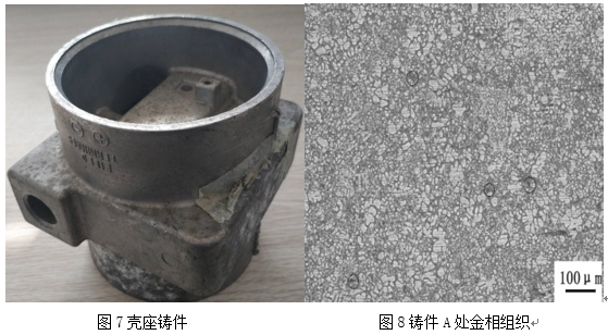 由圖5可知,殼座鑄件的裹氣部分主要集中在靠近內澆口處,由于內澆口附近金屬液流動速度相對較快,卷入的氣體也會較多。 用優化的工藝參數模擬得出的殼座鑄件充型時間為0.0 555 s,凝固時間為11.12 s,縮孔、縮松平均體積分數為1.10 %,平均裹氣量為0.00 059 g?cm-3,與9組正交試驗比較,總體相對較小,鑄件質量得到了較大提高,因此優化工藝可行。 六、生產驗證 選用J1125型臥式冷室壓鑄機,利用設計制造出的殼座壓鑄模具及優化的壓鑄工藝參數進行殼座壓鑄。圖7為生產出來的殼座,鑄件形狀清晰,未發現明顯缺陷。根據模擬結果對鑄件容易產生縮孔、縮松的位置(圖4中A點位置處)進行金相組織觀察,圖8為A處金相組織圖,可以看出鑄件微觀孔洞較少,且容易產生縮孔縮松的位置位于鑄件厚壁中間,不是工作位置,對鑄件質量影響較小。證明該鑄件質量合格,可以大批量生產。