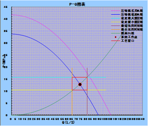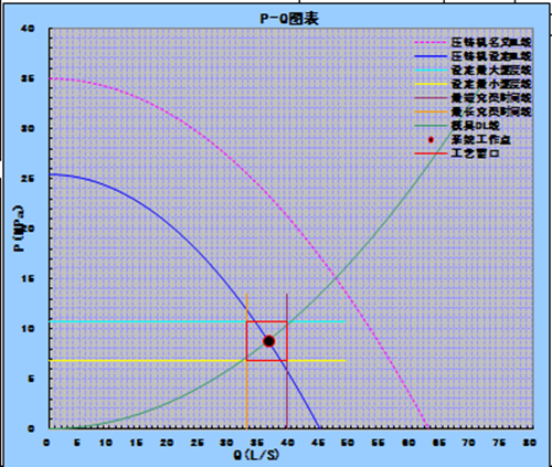 圖7:壓鑄工藝窗口示意圖 三、P-Q圖的設備線、模具線和壓鑄工藝窗口三者結合運用 P-Q圖技術是從能量守恒角度,通過壓力P和流量Q聯系起來分析壓鑄機、模具、鑄件之間的關系。壓鑄機為能量輸出端,模具為能量需求端,鑄件為壓鑄機和模具兩者共同作用的結果。當壓鑄機輸出能量和模具需求能量相符時,可得到理想的鑄件。反之質量難以保證。 1、合理的P-Q圖 當壓鑄機輸出的能量和模具需求的能量相符時,即P-Q圖的設備線和模具線的交點在壓鑄工藝窗口內部位置,見圖8,視為合理。