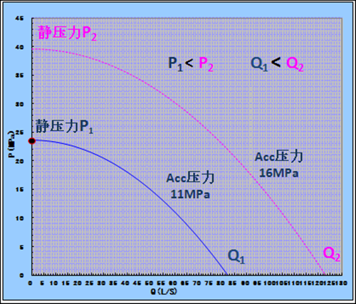 圖10:速度控制閥開度對P-Q圖的影響圖 2、調節儲能Acc壓力 由式(2)可知,壓鑄機儲能Acc壓力與金屬靜壓力P、流量Q均為正比關系,其變化如圖11所示。