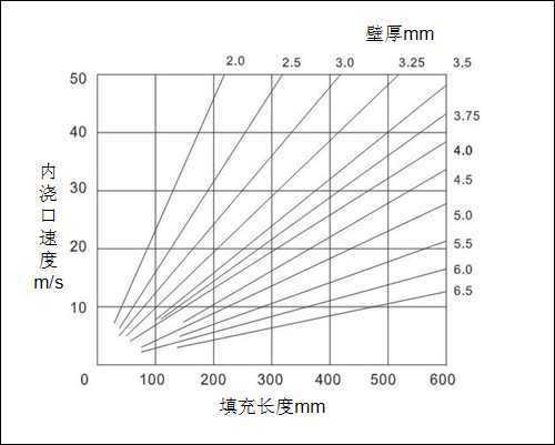 (8)式中,F鎖為鎖模力,T;K為產品投影面積加上澆排系統等全投影面積概算比率,取1.3;A為產品投影面積,cm2;P為鑄造壓力,MPa。此案例鑄件鑄造壓力取65MPa。 3、壓鑄工藝參數擬定 填充時間 (9)式中,t為填充時間,s;d為壁厚,mm;k=0.007。由式(9)得t=0.044s。取其范圍為40~50ms。 內澆口速度及流量系數Cd 由鑄件壁厚、填充長度、內外質量要求及圖15推薦值等綜合評估,取內澆口速度約為50m/s,取其范圍為45~55m/s。考慮鋁液在澆注系統中的能量損失,取Cd=0.5。