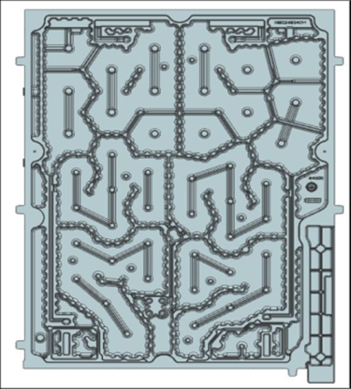 圖13:內澆口截面積Ag對P-Q圖的影響 五、濾波器腔體壓鑄件、模具及壓鑄機的相關工藝參數 1、壓鑄件 案例為濾波器大腔體鋁合金壓鑄件,如圖14所示,長×寬×高:504mm×357mm×60mm,平均壁厚d=2.5mm,鑄件重量G=7200g,壓鑄鋁合金材料為ENAC-44300。鑄件壁厚不均勻,內腔多處薄筋、孤立柱子等結構,較為復雜,壓鑄成型困難。