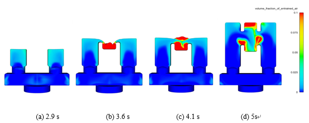 (1)低壓鑄造充型過程中,下落式結(jié)構(gòu)是產(chǎn)生卷氣的主要原因,卷氣量隨著下落式結(jié)構(gòu)的高度增加而增大。