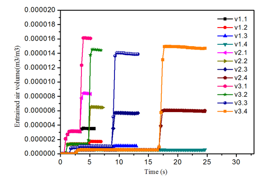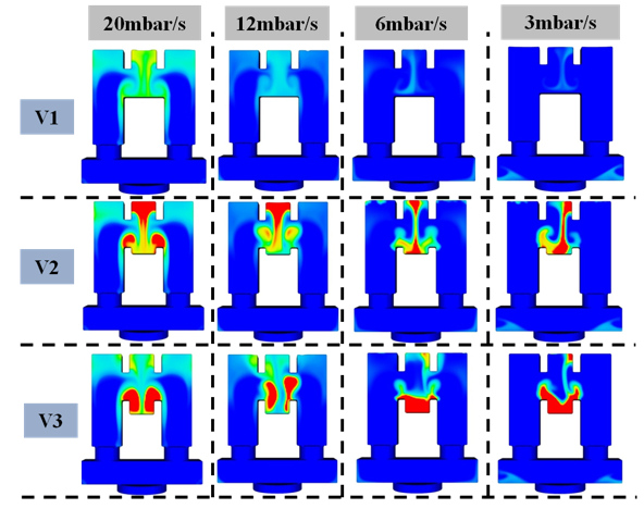 圖2:拉伸試樣取樣位置示意圖 2 試驗結(jié)果與討論 2.1 充型過程模擬結(jié)果 以V3.1方案為例,觀察充型過程中的卷氣的分布情況,見圖3。可以看出,充型時間為2.9 s時,金屬液平穩(wěn)上升;當(dāng)充型到3.6 s時,金屬液進(jìn)入下落(waterfall)區(qū)域,產(chǎn)生嚴(yán)重的湍流現(xiàn)象,卷氣嚴(yán)重;隨著充型過程繼續(xù)進(jìn)行,下落區(qū)域產(chǎn)生的卷氣會隨著金屬液的上升而隨機分布到鑄件中。 圖4的模擬結(jié)果顯示了不同模型在不同增壓速度下充型完畢后的卷氣分布情況,可以看出,模型V1的卷氣較少,隨著增壓速度增加,卷氣量略有提高。而模型V2和V3,無論增壓速度增加與否,都有不同程度的卷氣產(chǎn)生,并且分布情況有差別。 為了明確增壓速度和下落結(jié)構(gòu)對卷氣量影響的大小,對各個方案的卷氣結(jié)果進(jìn)行量化分析,將每種方案的卷氣量從Flow-3D中導(dǎo)出,見圖5。從卷氣量化分析結(jié)果可以看出,當(dāng)沒有下落結(jié)構(gòu)時,卷氣量隨著增壓速度的增大而增加;當(dāng)有下落結(jié)構(gòu)時,卷氣量隨著增壓速度的變化不明顯;同一種增壓速度下,增加下落結(jié)構(gòu)的高度,卷氣量會明顯增加。因此,鑄件中的下落結(jié)構(gòu)是影響卷氣量的首要因素,當(dāng)沒有下落結(jié)構(gòu)時,增壓速度會影響卷氣量。