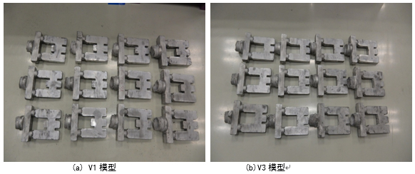 圖5:不同方案的卷氣量結(jié)果 2.2 實際鑄件力學(xué)性能與斷口分析 針對V1模型和V3模型,采用同樣的充型壓力速度300 Pa/s,進(jìn)行了生產(chǎn)試制,每種模型分別生產(chǎn)了12件,見圖6,可見鑄件質(zhì)量良好,輪廓清晰,選取其中6件進(jìn)行拉伸試棒加工。