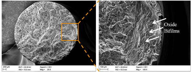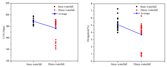 圖7:鑄件拉伸性能結(jié)果 通過拉伸試驗可以得到鑄件的抗拉強度和伸長率,見圖7。可以看出,沒有下落結(jié)構(gòu)的鑄件抗拉強度和伸長率比較穩(wěn)定,其抗拉強度平均值為191MPa,伸長率的平均值可以達(dá)到5.3 %;而具有30 mm 下落結(jié)構(gòu)的鑄件抗拉強度和伸長率都出現(xiàn)了一些比較低的值,其抗拉強度的平均值為178MPa,伸長率平均值僅為3.8%。選取帶有下落結(jié)構(gòu)中抗拉強度低于160MPa的試樣,對斷口進(jìn)行SEM分析,見圖8。可以看出,在斷口表面,存在較大的卷入型氧化皮缺陷,結(jié)合模擬結(jié)果分析,其主要原因為下落結(jié)構(gòu)中產(chǎn)生了較為嚴(yán)重的卷氣行為。