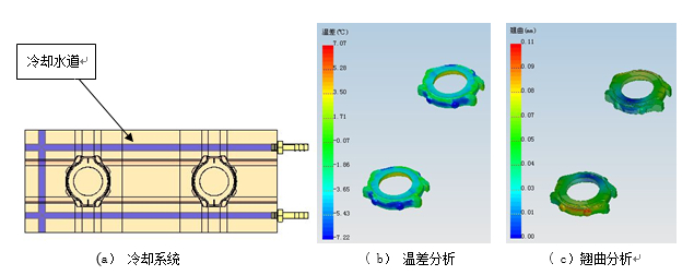 圖5澆注系統 三、冷卻及頂出系統的設計 1、冷卻系統的設計 合金的工作溫度為150~200℃。為了保證冷卻效果,采用直徑為6 mm的水道,孔壁距離型腔的壁面取15 mm。根據鑄件的結構特點和鋅合金材料的特性,設計出冷卻系統見圖6a。通過分析,溫差控制在3 ℃,最大翹曲量為0.11 mm,位于左右凸臺位置,,滿足客戶的需求,見圖6b和圖6c。