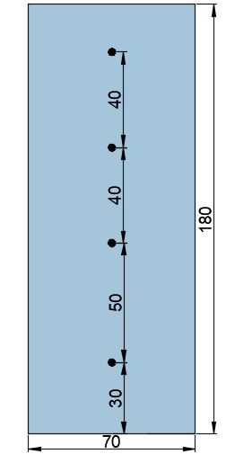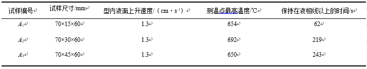 試驗用三乙胺冷芯盒法型芯由蘇州某公司提供。涂料的涂覆采用雙層涂覆工藝,分步進行,具體步驟如下: 1.2 熔煉與澆注 試驗材料為鑄造鋁合金EN AC-43000,將切割成塊狀的鋁合金錠裝入SG2-3-12型坩堝爐中熔煉,坩堝設定溫度為750 ℃,澆注溫度控制在720~730 ℃之間。 為了研究鑄件厚度和高度的變化對型內氧化處理效果的影響,澆注了2組尺寸不同的試樣,分別為厚度不斷增加的A1、A2、A3試樣和高度為A1試樣3倍的B試樣。其尺寸分別為70 mm×15 mm×60 mm、70 mm×30 mm×60 mm、70 mm×45 mm×60 mm、70 mm×15 mm×180 mm。 澆注過程中,在型腔表面預埋0.2 mm的K型熱電偶,采用4通道TH-TZ多路記錄儀采集記錄澆注過程中試樣不同位置的溫度變化。對于A1、A2、A3試樣,測溫點位于其側面的幾何中心,用于比較不同厚度試樣型內氧化反應界面的溫度變化。對于B的試樣,測溫方案見圖1,在不同高度處設置測溫點,用于比較隨高度的增加反應界面的溫度變化。