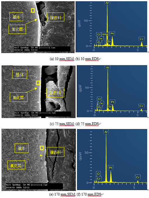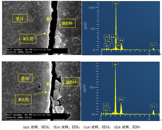 圖4:不同澆注速度下B試樣表面氧化層的宏觀形貌圖 從圖4a中取樣,預處理后做SEM觀察和EDS分析,見圖5。結果可知,在試樣截面均可觀察到氧化層,厚度為1~2 μm。氧化層與基體結合良好,主要組成元素為Al、O、Cr。但A3試樣氧化層與基體的組織區(qū)別不明顯,型內氧化處理的效果稍差,EDS分析確認在鑄件表層含有氧化劑分解后的元素成分。