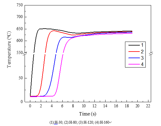 圖5:B試樣不同高度處氧化層截面形貌及EDS結果(30、80、160???) 圖6為型壁不同高度處的溫度時間曲線。由圖6可知,隨著試樣高度的增加,型壁表面的升溫速率降低,最高溫度下降,同時曲線平穩(wěn)階段的溫度也降低。溫度的差異對型內氧化過程產生了一定的影響,減緩了反應進行的劇烈程度,有利于提高表面質量,但不利于分解產物的擴散,不利于氧化層增厚。底部位置的氧化層反應更迅速且擴散過程進行的充分,導致底部氧化層較厚,且氧化層中O和Cr元素的含量較高。而上部的型腔,受到早期進入型腔金屬液的加熱作用,可能較早達到其分解溫度,當與鋁液接觸時,已分解的部分氧化劑不參與氧化反應,最終由于氧化劑的量不足,不能有效地形成氧化層。另一方面,鋁液到達時溫度較低,處于液相上以上的時間短,不利于氧化劑分解產物的擴散。