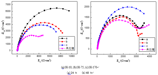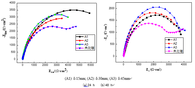 圖8:不同厚度試樣腐蝕一定時間后的電化學阻抗譜
