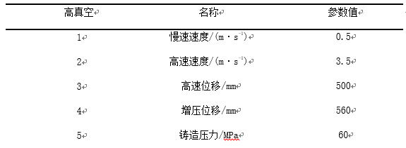 圖6:帶排氣塊的模具設計 2.4普通排氣工藝參數的選擇 普通排氣塊通過多次試制,得出了壓鑄工藝使用的最優參數,見表2;實際的沖頭速度也設置為3.5 m/s,鑄造壓力也為60MPa。
