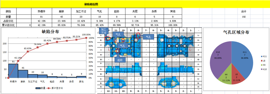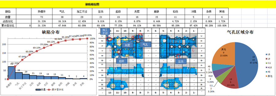 表2:高真空工藝參數 3、兩種工藝批量生產后缺陷數據的對比 3.1高真空及普通排氣塊工藝的缺陷數據統計 采用高真空工藝進行批量試制,統計最終的缺陷數量及位置見圖7。