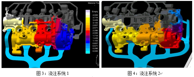 圖2:缸蓋罩殼體的凝固分析 凝固模擬發現缸蓋罩主要的熱節集中在螺栓過孔。針對容易產生縮孔的位置,采取調整該處位置內澆口鋁液的流量與角度?;阼T件結構,設計了2種澆注系統。方案1(見圖3)采用水平推進的方式布置澆口,并且在熱節位置增加渣包。從充型模擬結果看,整個鑄件充型較為穩定,但在雙油封孔位置存在流速過慢和包卷的現象;方案2是在方案1的基礎上進行了改進(見圖4),方案2可以較好的改善雙油封孔位置的填充,并且消除了鋁液在該位置流態的包卷,整個填充流態較為平穩。針對方案2,對鑄件進行了氣壓分析、填充溫度分析、填充速度分析,見圖5。