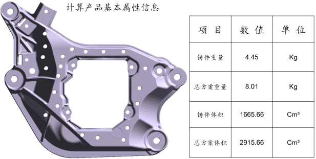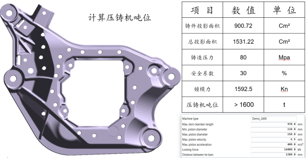 圖1:橫梁產(chǎn)品結(jié)構(gòu)圖 2.前期計(jì)算與分析 在產(chǎn)品前期開發(fā)階段,將毛坯3D導(dǎo)入MAGMASOFT?,軟件可自動計(jì)算出包含產(chǎn)品體積,重量,截面積,投影面積等在內(nèi)的基礎(chǔ)數(shù)據(jù),然后進(jìn)一步計(jì)算出生產(chǎn)該產(chǎn)品所需要的壓鑄機(jī)臺噸位并與軟件機(jī)臺數(shù)據(jù)庫對應(yīng)的機(jī)臺相匹配,如圖2所示。
