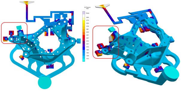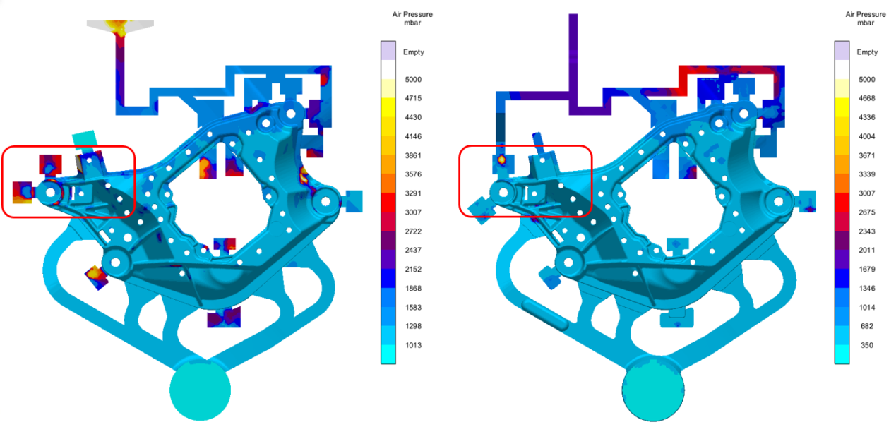 b.初始澆排系統(tǒng) 圖6:充型流態(tài)與排溢系統(tǒng) 3.3 排溢系統(tǒng)優(yōu)化 在確定初始排溢系統(tǒng)后,再次進(jìn)行流動模擬,發(fā)現(xiàn)現(xiàn)有的排溢系統(tǒng)不夠完善,產(chǎn)品末端存在高氣壓,見圖7a所示。高氣壓區(qū)域有非常大的氣孔風(fēng)險(xiǎn),將會嚴(yán)重的影響產(chǎn)品成型,焊接和裝配。于是根據(jù)模擬結(jié)果優(yōu)化排溢方案,在高氣壓區(qū)增加排氣道來降低氣體聚集的風(fēng)險(xiǎn),見圖7b所示。實(shí)際生產(chǎn)中需要輔以真空工藝,按照此工藝設(shè)計(jì)基礎(chǔ),再次模擬,觀察和對比優(yōu)化前后的產(chǎn)品氣壓分布,發(fā)現(xiàn)增加排氣道及增加真空工藝后,原高氣壓區(qū)域的氣壓值由5000mbar降為1000mbar,結(jié)果顯示高氣壓問題得到有效的改善,詳見圖7。