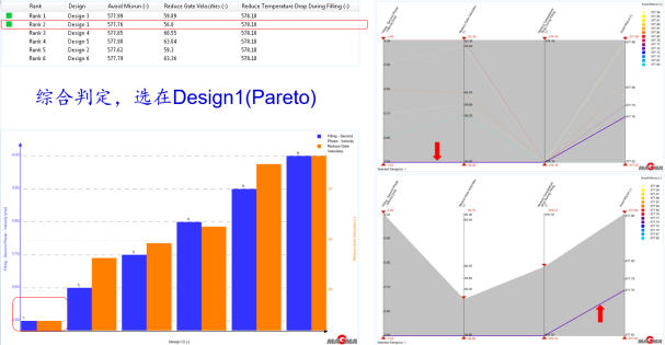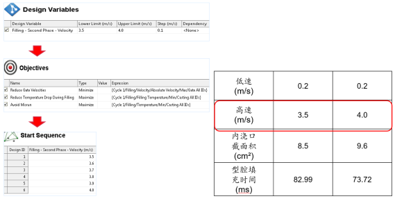 c.氣壓對比分析圖 圖7:排溢系統(tǒng)優(yōu)化和優(yōu)化模擬結(jié)果對比 4.DoE工藝參數(shù)優(yōu)化 在確定好澆排系統(tǒng)之后,還需要對壓鑄工藝參數(shù)進(jìn)行設(shè)計(jì)和計(jì)算。MAGMASOFT?的自主優(yōu)化工具,使得工程師能通過了解工藝變量對鑄件質(zhì)量的影響,更為省時(shí)省力地探索更大的設(shè)計(jì)空間,進(jìn)而找到最優(yōu)的壓鑄模具和工藝布置方案。與傳統(tǒng)模擬不同,自主模擬只需要工程師設(shè)定一次模擬,但是,很多模擬運(yùn)行將覆蓋全部工藝窗口。該軟件自主地挑出可能的設(shè)計(jì),進(jìn)行分析并采用統(tǒng)計(jì)數(shù)據(jù)方式匯總所有結(jié)果。 基于澆排系統(tǒng)設(shè)計(jì)完成的基礎(chǔ)之上,借助DoE自主優(yōu)化工具進(jìn)行壓鑄工藝參數(shù)的優(yōu)化。高速速度是影響鋁液填充和產(chǎn)品質(zhì)量的關(guān)鍵參數(shù)。以高速速度的DoE優(yōu)化過程為研究對象,進(jìn)行分析。設(shè)定高速速度在3.5-4.0m/s之間,迭代步長設(shè)定為0.1,以降低澆口速度及減小冷隔缺陷為目標(biāo)對象。通過軟件進(jìn)行大數(shù)據(jù)分析與統(tǒng)計(jì)后,推薦出最佳成型工藝參數(shù),選擇高速速度3.5m/s既可以滿足澆口速度低,降低模具充蝕,又可以保證產(chǎn)品的質(zhì)量。詳見圖8所示。