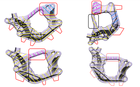 圖3:工藝參數(shù)計(jì)算表 3.澆排系統(tǒng)分析 3.1 澆注系統(tǒng)選擇 根據(jù)軟件計(jì)算出來的內(nèi)澆口截面積,再結(jié)合產(chǎn)品結(jié)構(gòu),將所有的進(jìn)澆可能性方案全部導(dǎo)入軟件。圖4為不同位置進(jìn)澆分析,其中黃色線為各自的填充區(qū)域,由黑線間隔,粉色線和藍(lán)色線為融合金屬液填充區(qū)域。其中對4個(gè)方案進(jìn)行分析和判斷如下:方案1共五個(gè)澆口,澆口分布均勻,進(jìn)澆平衡,可實(shí)現(xiàn)整體進(jìn)澆。壓力也相對傳遞均勻,保證致密度。需注意最末端填充區(qū)域,有冷料堆積充填與排氣不良風(fēng)險(xiǎn)。方案2共三個(gè)澆口,產(chǎn)品大體積區(qū)域?qū)?yīng)大澆口,保證充填質(zhì)量與壓力傳遞。但厚大澆口容易造成局部溫度過高,引起變形及對模具形成不良影響。同時(shí)此擺放位會拉長充填行程。方案3共三個(gè)澆口,產(chǎn)品大體積區(qū)域?qū)?yīng)大澆口,保證充填質(zhì)量與壓力傳遞。但厚大澆口容易造成局部溫度過高,引起變形及對模具形成不良影響 。方案4共三個(gè)澆口,產(chǎn)品大體積區(qū)域?qū)?yīng)大澆口,保證充填質(zhì)量與壓力傳遞。但厚大澆口容易造成局部溫度過高,引起變形及對模具形成不良影響。