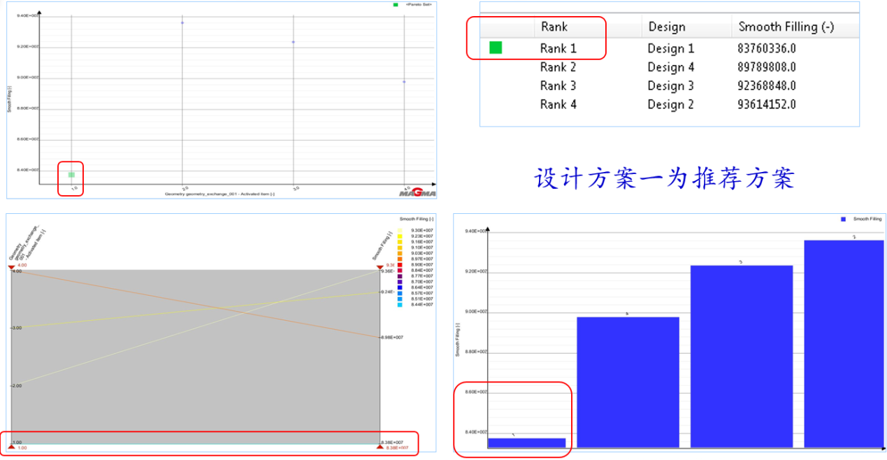 c.方案3 d.方案4 圖4 進(jìn)澆分析 根據(jù)設(shè)置的工藝條件,軟件完成四種方案的計(jì)算后進(jìn)行多維度的大數(shù)據(jù)統(tǒng)計(jì),根據(jù)鋁液流動順暢的評價(jià),推薦最佳進(jìn)澆方案為方案1,詳見圖5。