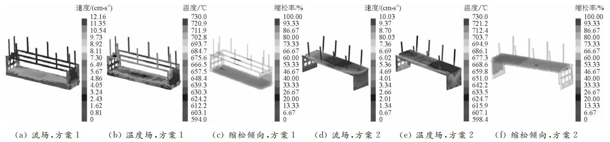 圖3:鑄造工藝設計方案2 此澆注系統采用和方案1類似的形式,其中側冒口直徑Φ40mm,內澆口厚度12mm,長度為190mm,橫澆道、直澆道、內澆道截面積比為1:2.8:4.6。方案2與方案1澆注系統相比,有著相同的澆口比,但是鋁 液進入底板上升高度更高。 3、CAE模擬分析 CAE模擬從充型結束溫度、各部位充型時間來對比方案的溫度場分布是否均勻,鑄件底板部位是否充型迅速,并根據縮松情況判斷鑄件可能出現缺陷的部位,見圖4??梢钥闯?,①充型結束方案1溫度場更均勻;②根據鑄件各部位充滿時間判斷鑄件重要部位底板,方案1充型更平穩;③去除后,鑄件縮松缺陷相當。