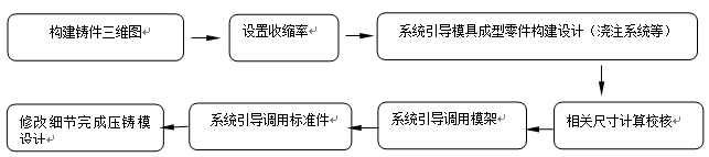 圖1:筆記本電腦后蓋三維圖 2、壓鑄設備與模具設計參數 使用CAD集成系統進行三維實體造型,也可以使用其他專業造型軟件(UG-NX、Pro/E)進行造型后導入CAD集成系統。通過系統的手冊查詢和相關的尺寸計算模塊,可以計算出鑄件的體積和質量。鑄件的體積為46.8cm³,質量為85.2 g,投影面積為123 m㎡,模具型腔為一模一腔。澆注系統和溢流槽的總體積為55.4 cm³,質量為100.8 g,可以計算鎂合金熔液總澆注質量為186 g,壓鑄機所需的最小鎖緊力為1 012 kN,選擇J1118H(180t)1800 kN臥式冷室壓鑄機,最大鎖緊力為1 800 kN,壓鑄電機座板行程為350 mm,注射力為200 kN,一次金屬注射量為(鎂合金)700 g,能滿足生產需要。 3、基于大數據分析的鎂合金壓鑄模快速設計系統 壓鑄模設計的主要工作是模具工作零件的創建,包括型腔、斜滑塊、澆注系統、頂出機構等。首先基于大數據分析結構優化,建立鑄件的三維模型,設定鎂合金材料的收縮率,基于大數據分析引導設置,設置模具分型面,自動生成模具工作零件,調用鎂合金壓鑄模標準模架和標準件,修改細節,完成設計。 3.1 流程設計 壓鑄模設計流程:①建立三維圖;②系統引導建立模具工作零件,包括設定收縮率、分型面設置、模具凹凸腔、周邊斜滑塊、中心澆注通道和分流通道設計;③系統引導調用標準模架和標準件,最終設計點澆口、頂出機構以及壓鑄模加熱和冷卻系統,具體流程見圖2。壓鑄模快速設計系統大大節省了數據查詢和三維建模的時間,基于壓鑄件缺陷的大數據分析可以盡量避免大量缺陷產生。將傳統壓鑄模設計周期從18天縮短為1天左右,大大節省了壓鑄模設計時間,提高了設計效率。