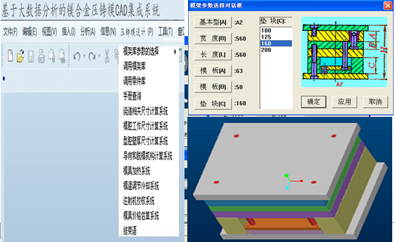 (a)動模 (b)定模 圖3:壓鑄模工作零件 3.4 標準模架調用 用戶在客戶端成功配置相關環境并安裝組件后,可以在基于大數據分析的鎂合金壓鑄CAD集成系統的菜單欄和工具欄上加載相關模塊的控制按鈕(見圖4)。從圖4可以看出,壓鑄模CAD集成系統包括模架庫參數的選擇、模架庫調用、零件庫調用、手冊查詢、各類尺寸計算公式、模具冷卻及加熱系統、注射機校核、模具價格估算系統等。