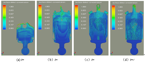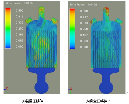 圖2:鑄件充型過程 2.2 普通壓鑄件與真空壓鑄件模擬分析 在表2工藝參數下,對普通壓鑄件和真空壓鑄件進行缺陷模擬分析,其結果見圖3。從模擬結果可知,普通壓鑄件的氧化夾雜分布范圍廣,主要集中在鑄件中心和兩側,且程度較真空壓鑄件高。真空壓鑄件的夾雜缺陷,主要集中在溢流槽,溢流槽在成形后可以去除,少量分布在鑄件中心,分布范圍小,夾雜缺陷程度低。