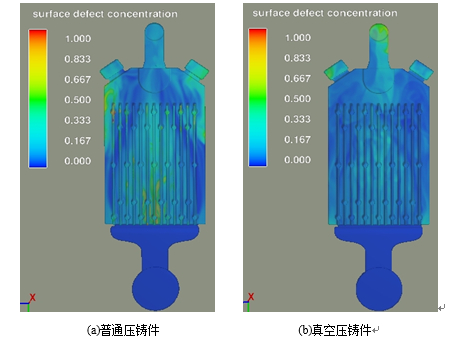圖3:缺陷模擬結果 同樣在表2工藝參數下,對普通壓鑄件和真空壓鑄件進行卷氣場模擬分析,其結果見圖4。 從模擬結果可知,普通壓鑄件的卷氣區域主要集中在壓鑄件的心部,靠近澆道處也有少量卷氣,卷氣量比真空壓鑄件高。真空壓鑄件的卷氣區域主要集中在溢流槽中,少量分布在鑄件的中心區域,整體的卷氣量較少。由此得出,真空壓鑄件組織較為致密。