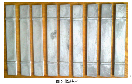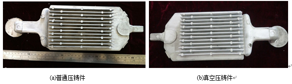 圖5:壓鑄件宏觀照片 從仿真結果可知,散熱器壓鑄件的缺陷和卷氣主要集中在心部。因此,分別取普通壓鑄件和真空壓鑄件相同位置的散熱片,制備金相試樣進行對比研究,散熱片見圖6。