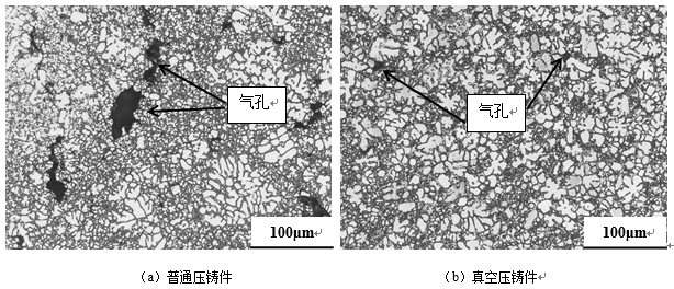 圖6:散熱片 圖7為散熱片微觀組織??梢钥闯觯胀▔鸿T件的氣孔分布范圍較廣且氣孔較大,并且存在氧化夾雜;而真空壓鑄件也同樣存在氣孔,但氣孔分布范圍較小且氣孔也比較小。相對比而言,鎂合金真空壓鑄件散熱片上的氣孔缺陷,較普通壓鑄件少,氧化夾雜也明顯減少了,組織也較為致密。