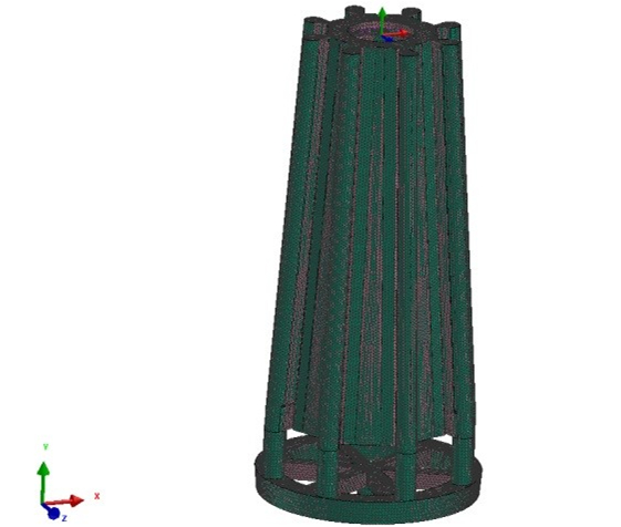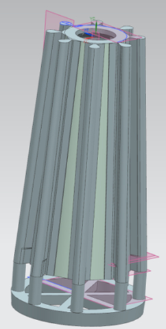 圖1:殼體結構圖 2、殼體澆注系統 殼體澆注系統見圖2,由直澆道、橫澆道及立筒縫隙澆道組成。橫澆道分為外圓形橫澆道及內“米”字形橫澆道,橫澆道截面為梯形結構,可以提升澆注系統的擋渣能力,提高合金的流動性及充型能力;8處立筒縫隙澆道均布在殼體外形面四周,均勻分配合金液的流量,減少合金過熱傾向,同時,立筒縫隙澆道可保證殼體澆注過程合金平穩充型,使殼體鑄件凝固過程獲得極佳的補縮效果。