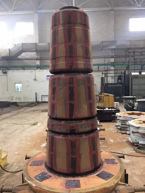 圖3:砂芯 3、殼體砂芯 考慮到殼體鑄件為鎂合金,且熔煉量約1 t,殼體砂芯采用整體粘土砂工藝。砂芯中間放置芯骨,澆注過程中,產生的大量氣體通過中間芯骨順利排出,避免發生反應產生氣孔、夾渣及疏松缺陷。 在殼體砂芯所有環筋、凸臺等熱節及厚大部位設置專用冷鐵,立筒縫隙澆口前放置冷鐵,在冷鐵工作面邊緣與粘土砂之間放置激冷砂,避免立筒縫隙澆口兩側過熱產生疏松缺陷,見圖3。 4、數值模擬 4.1 模型與材料熱物性參數
